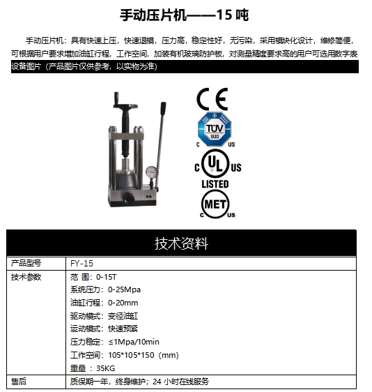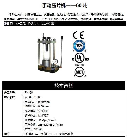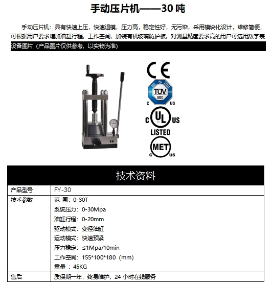 手動壓片機:具有快速上壓,快速退模,壓力高,穩定性好,無污染,采用模塊化設計,維修簡便,可根據用戶要求增加油缸行程,工作空間,加裝有機玻璃防護板,對測量精度要求高的用戶可選用數字表